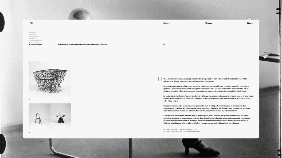 Intimement lié au monde de l'art, tant dans sa représentation que dans sa symbolique, la chaise, objet familier de notre quotidien, a traversé les époques ainsi que les mouvements artistiques. Pourtant, sa représentation a subi des transformations remarquables, reflétant évolutions sociales, culturelles et esthétiques de chaque période. Sous forme de site website, je rend compte de cette évolution, en analysant comment la chaise a été utilisée et interprétée par les acteurs de ces périodes/mouvements - comment elle a été intégrée dans les œuvres ou réalisations pour exprimer des idées, des émotions et des visions du monde. Ce projet s’inscrit dans la continuité de mon mémoire, avec ici une approche différente incluant une dimension symbolique et artistique.